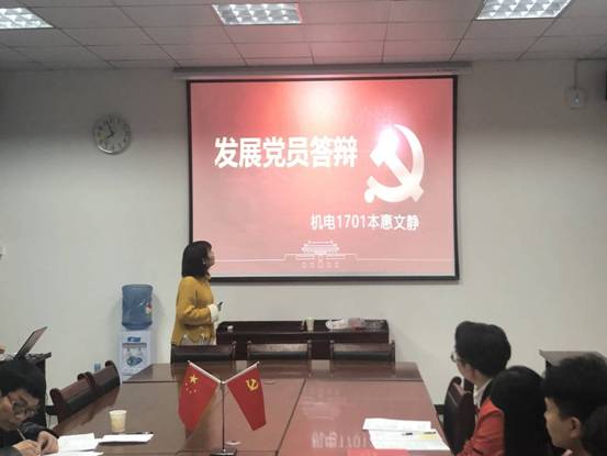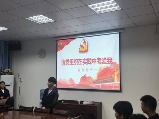 11位申请发展的入党积极分子根据抽签顺序依次进行答辩,答辩者首先就个人基本情况、入党动机、个人思想进步过程与现实表现进行陈述。