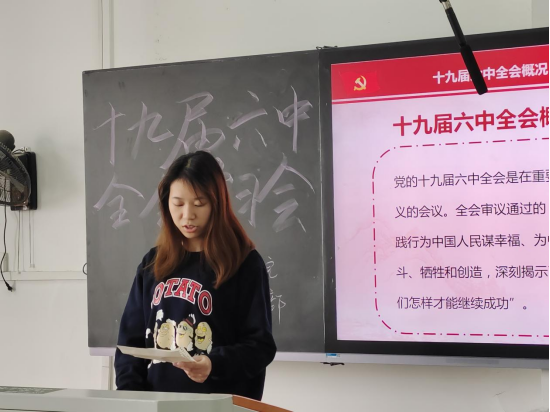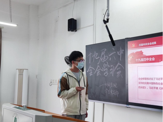 会上,由三名学生党员黄愈佳、刘定邦、边威分别向大家分享自身学习心得,他们讲到,在建党百年这个继往开来的重大历史时刻,党的十九届六中全会作出我们党历史上第三个历史决议,聚焦总结党的百年奋斗重大成就和历史经验,突出中国特色社会主义新时代这个重点,同党的前两个历史决议既一脉相承又与时俱进,顺乎党心军心民心,顺乎时代发展要求,具有深厚的政治根基、理论根基、实践根基、群众根基。在新时代新征程上夺取新的更大胜利具有重大现实意义和深远历史意义。