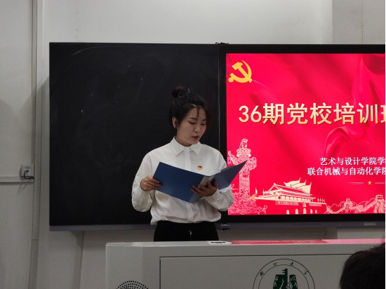 第三项:机械学院学生积极分子代表彭义真、艺术学院学生党员代表张锐依次上台发言,分别表达了对本期党校培训班召开的祝贺,感谢组织提供这个学习和交流的平台,以及对接下来学习学有所获的期翼。