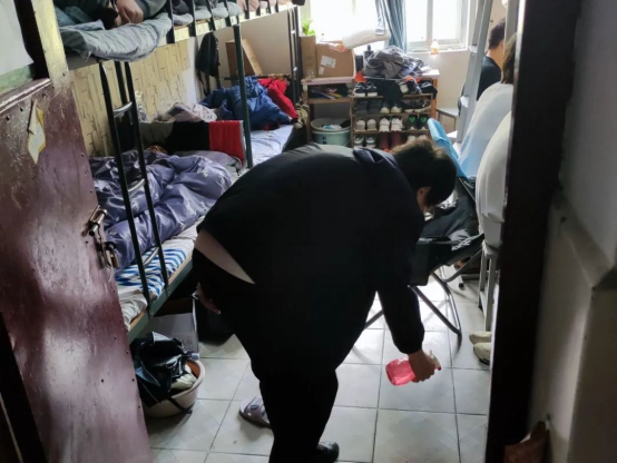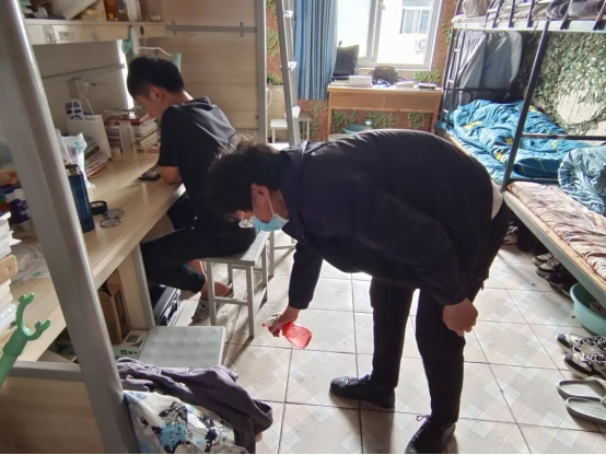 学生党员、学生干部、入党积极分子们积极发挥先锋模范带头作用,踊跃参与卫生消杀,对内八、外一两栋宿舍楼进行全方面、全覆盖、无死角的宿舍及公共区域消杀检查工作,彻底阻断新冠病毒的传播途径,确保疫情防控工作零盲区。