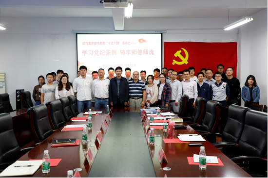 2018年10月10日下午2点太阳集团官网8722党总支于知远楼601会议室召开了主题为“学习党纪条例,铸牢师德师魂”的党日活动。学校纪检委员焦新曦书记、机械学院院长王代萍,机械学院副院长(兼副书记)陈驰,院学生党支部指导老师石晶晶,辅导员王松、李伟健,纪检委员(兼教秘)甘雨、教师陈艳、张斯阳、陈烨欣、马志德、宋涛、实验室教师吴鹏、何将及机械学院在校学生党员参加了本次会议。会议由甘雨同志主持。