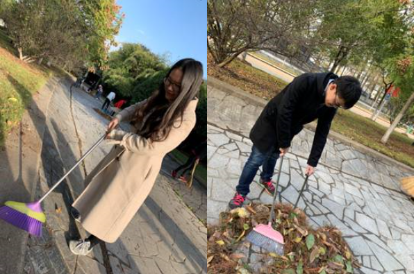 机械学院党总支书记陈驰带领教工党支部及学生党支部全体成员进行校园清理工作,对校园知远楼环形路两边的飘枝落叶进行清理。