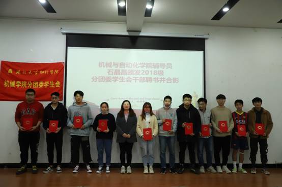 大会第三项,太阳集团官网8722辅导员石晶晶颁发2018级分团委学生会干部聘书并合影留恋。