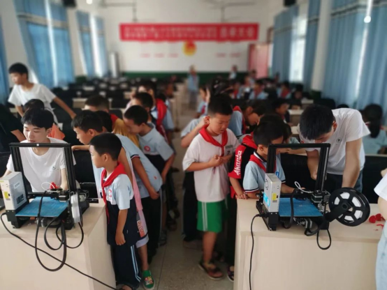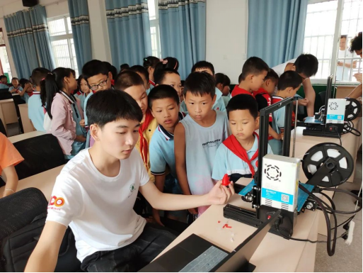 活动中团队成员为胡市中心小学的同学们普及3D打印技术的知识,并和小组员一起进行3D打印机的演示操作,志愿队的老师和大学生们悉心指导,鼓励小同学们亲身参与体验3D技术。