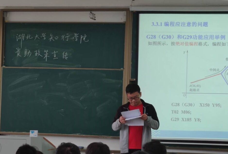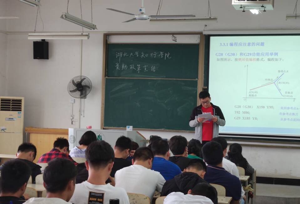 活动由上届获励志奖学金的同学们利用课间的10分钟时间,在本院各个班级进行学生资助政策的宣传,弘扬积极向上的学风,倡导自强自立、受助感恩、励志成才、充分发挥学生资助工作的育人功能,不断提升学生资助工作水平,形成良好的资助育人环境。