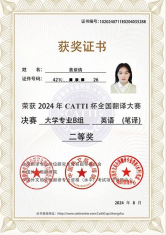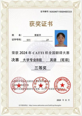 近日,第三届CATTI杯全国翻译大赛结果揭晓,我校外国语学院首次参加该项比赛获得优异成绩。其中,商务英语2101班黄祡倩同学和英语2104班蔡新平同学分别荣获全国总决赛笔译二等奖和三等奖。