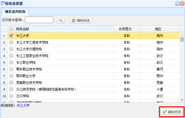 院校名称使用一律使用系统提供的院校选择填写。院校列表中选择院校后点击确定所选完成院校选择。
