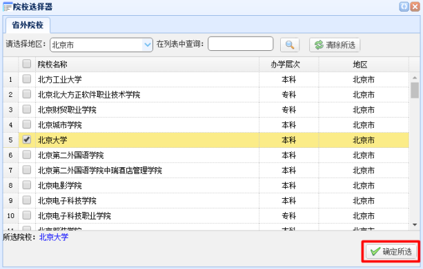 省外高校请先选择地区,院校列表中选择院校后点击确定所选完成院校选择。如下图: