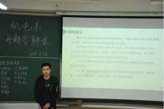 毕业设计开题答辩是一个增长知识,交流信息的过程,不仅学生可以从答辩老师那里获得新的知识和宝贵的建议,而且答辩老师也可以从有独特见解的学生设计中得到启迪。同时,毕业设计答辩是大学生全面展示自己的德、智、体和口才的最佳时机。此次毕业设计答辩给同学们提供了一个实战性的平台,考验了同学们的胆量与魄力,同时也体现了机械学院在新时代背景下对教育体系的完善程度。