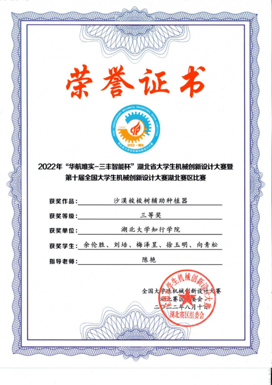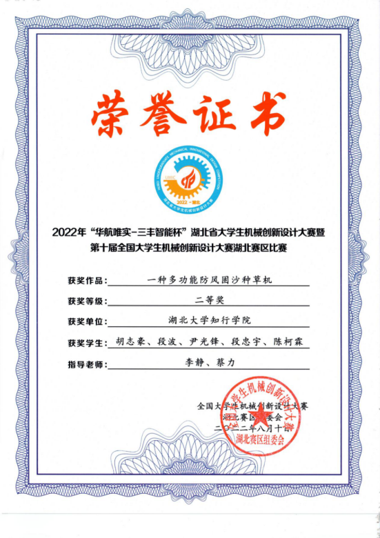 2022年湖北省大学生机械创新设计大赛暨第十届全国大学生机械创新设计大赛在武汉科技大学举行,本届大赛由全国大学生机械创新大赛组委会以及教育部高等学校机械基础课程教学指导委员会联合主办。机械创新大赛是本专业举办的最高级别赛事,是机械学院科研水平和学生综合实力的试金石,历来为各高校高度重视。本次大赛我院获二等奖3项,三等奖3项。