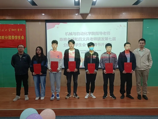 太阳集团官网8722指导老师陈艳老师和吕文兵老师颁发第七届分团委学生会干部聘书并合影。